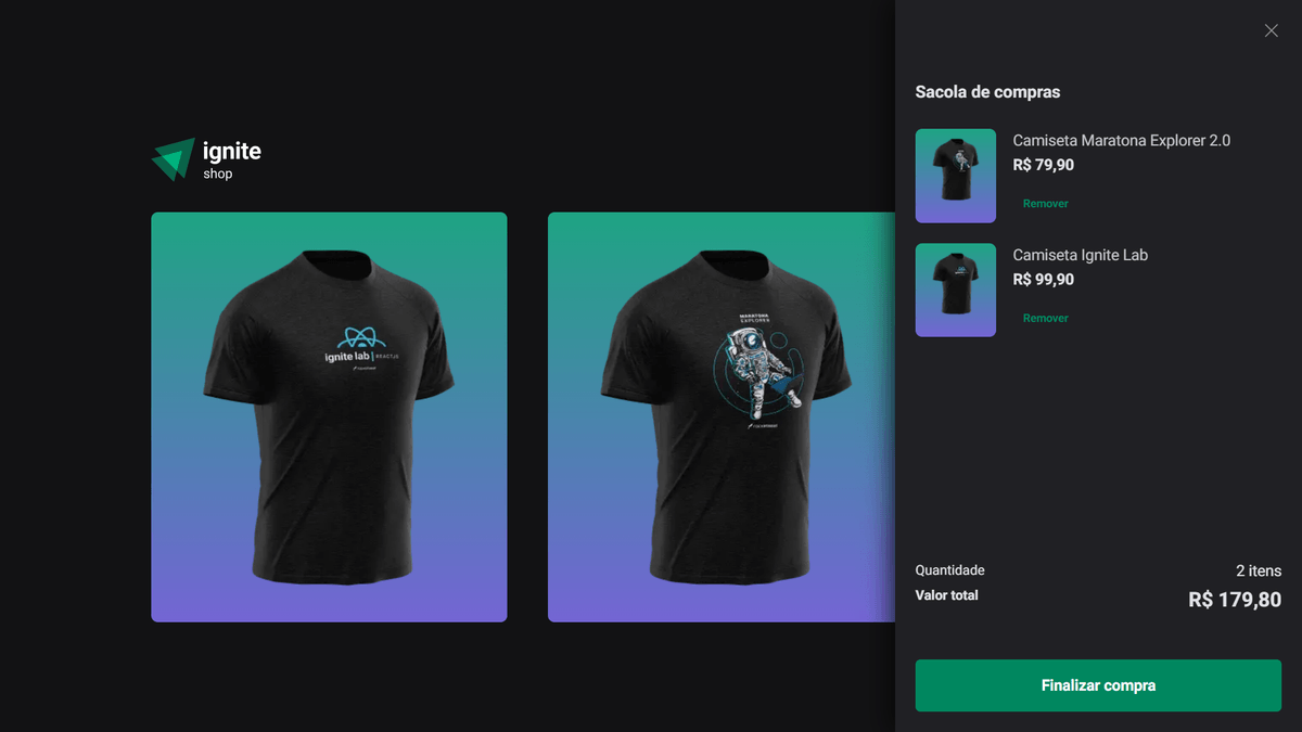 Ignite Shop, uma plataforma de e-commerce para comprar camisetas temáticas da Rocketseat. O projeto utiliza o Next.js para implementar a Renderização do Lado do Servidor (SSR) e a Geração de Site Estático (SSG) para melhorar o desempenho e o SEO.